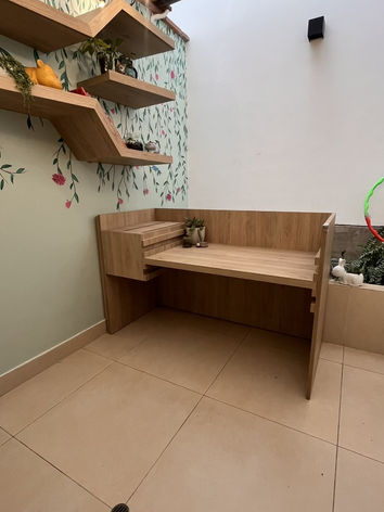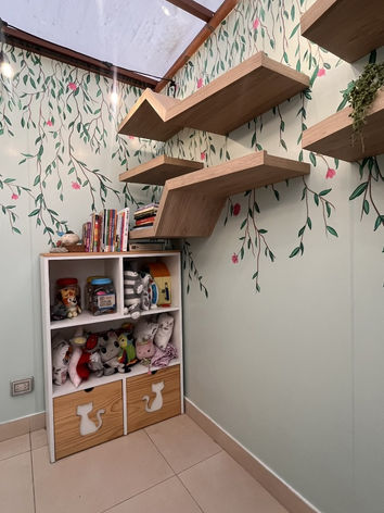 Este proyecto consistió en diseñar un estudio y área de lectura para una niña de 9 años, con el objetivo de acompañarla en distintas etapas de su vida. Para lograr esto, el escritorio incluye un tablero regulable que se ajusta a su crecimiento, asegurando funcionalidad a largo plazo. El espacio, creado al techar un patio contiguo a su dormitorio, funciona como una extensión natural de su habitación. Inspirado en la naturaleza, el diseño incorpora una planta principal, conocida como costilla de Adán, que simula el tronco de un árbol, mientras que las repisas evocan ramas, creando un ambiente lúdico y orgánico. El uso de verde menta como color predominante añade frescura y vitalidad al ambiente, fomentando la concentración y la creatividad, y convirtiendo el estudio en un espacio ideal para el aprendizaje y la inspiración personal.